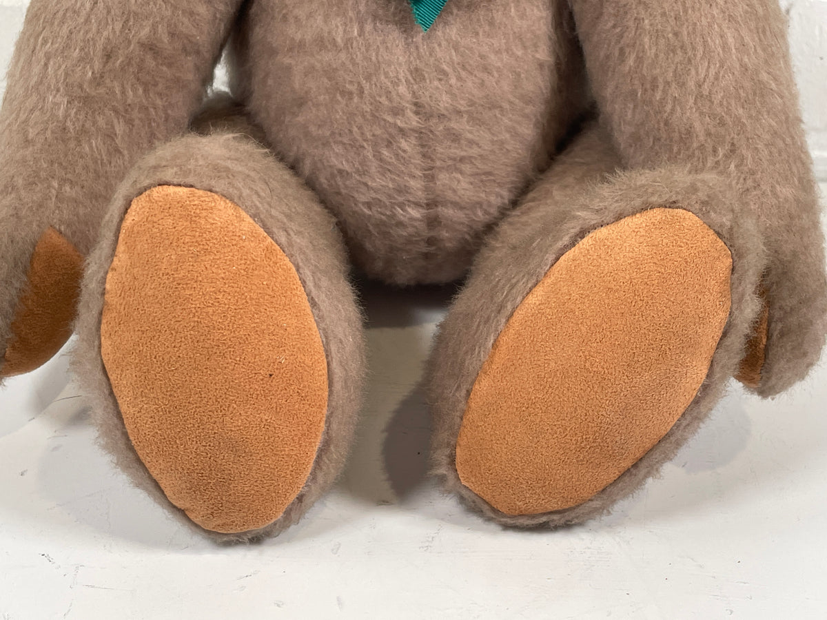 Vintage Handmade Mohair Teddy Bear with Suede Pads & Teal Bow – Jointed Limbs