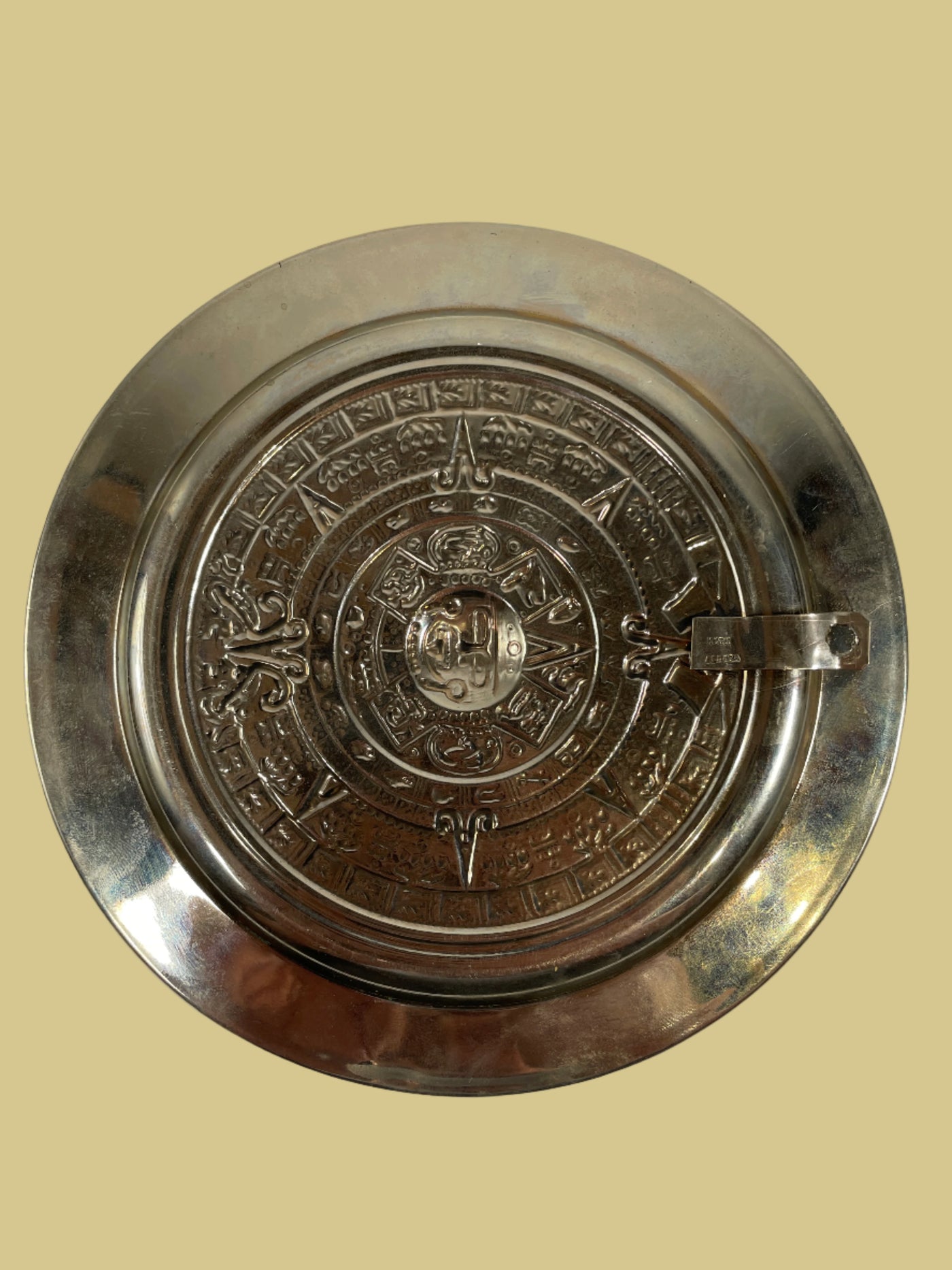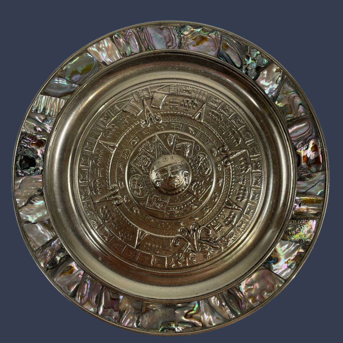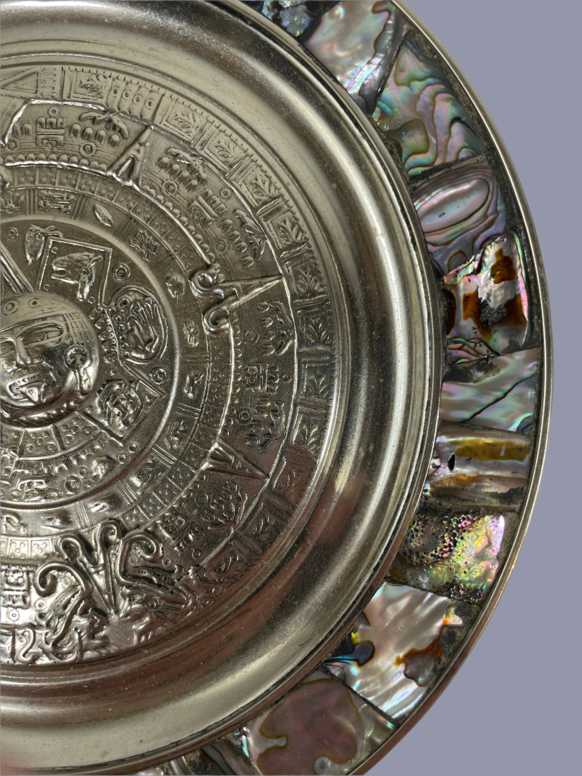 Mexican Alpaca AZTEC Calendar Silver Tray Dish Abalone Shell Rim German Silver