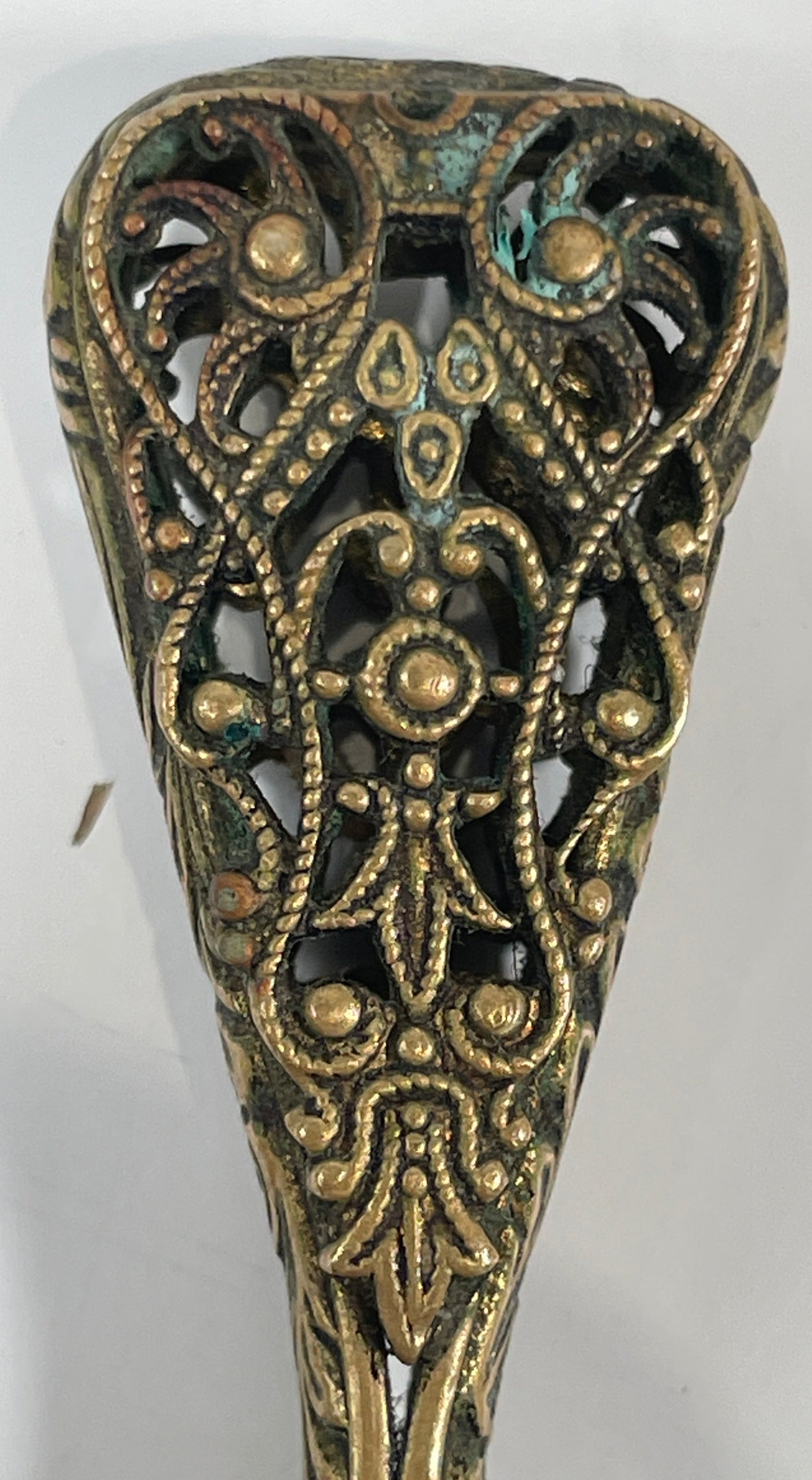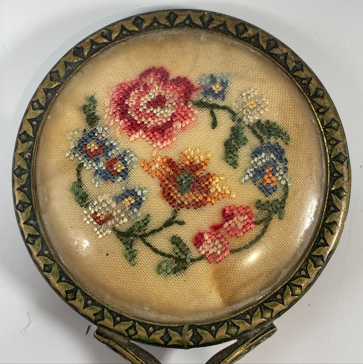 Antique Small Mirror in Brass Decorative Pattern. Embroidery on the Back