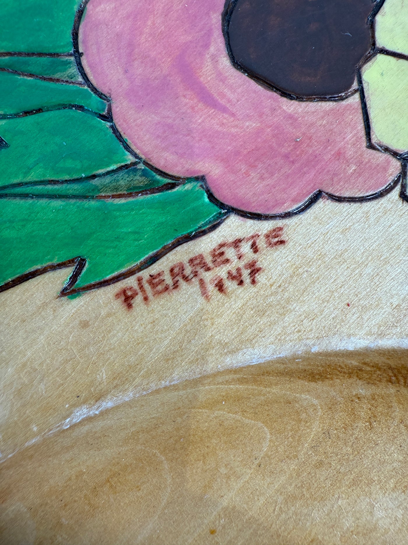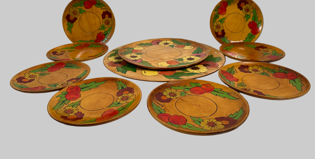 Complete 1947 Pierrette Hand-Painted Wooden Plate Set – 10pc Quebec Folk Art Dinnerware