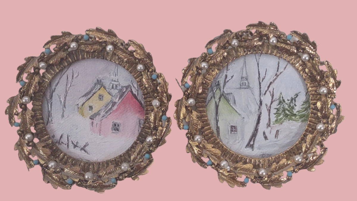 Peintures miniatures italiennes vintage de style rococo – Cadres dorés avec fausses perles et turquoise, support en velours rouge – Paire