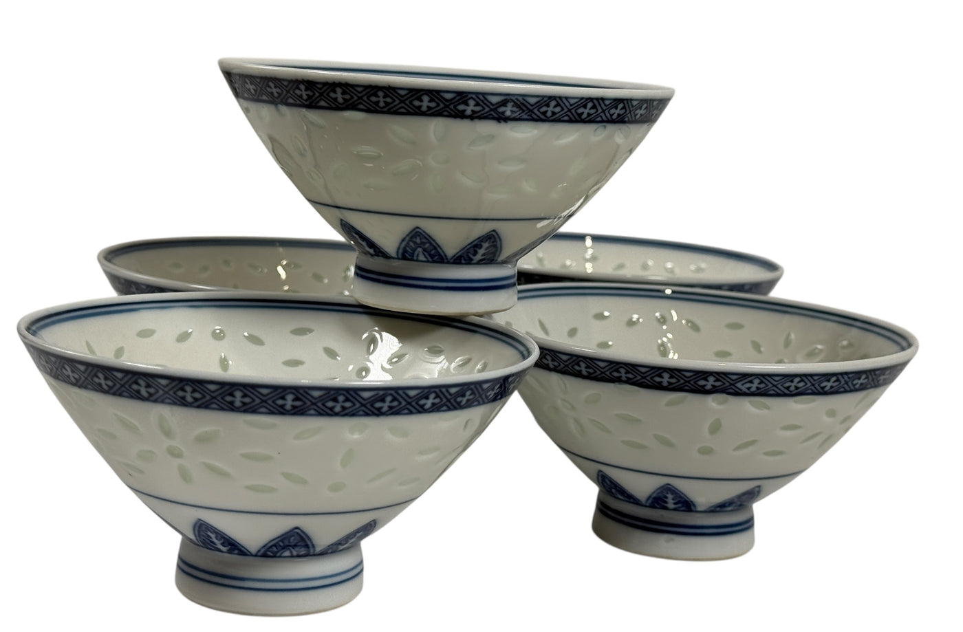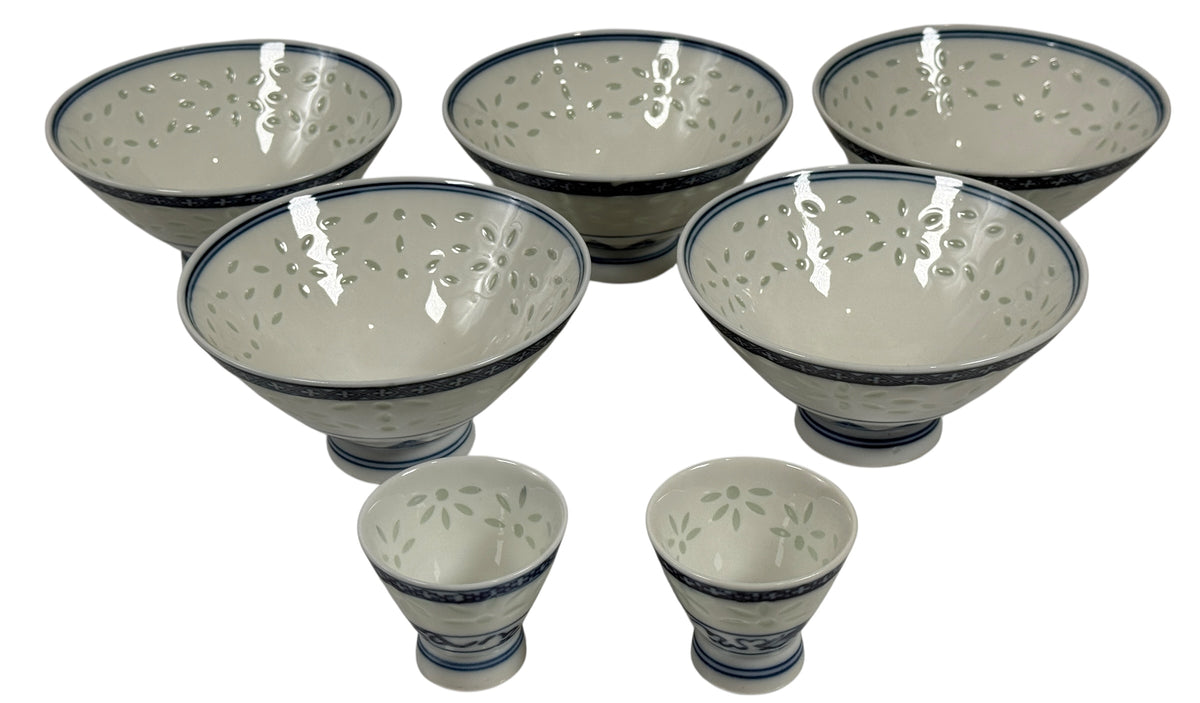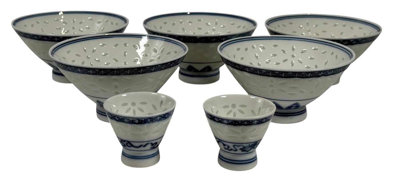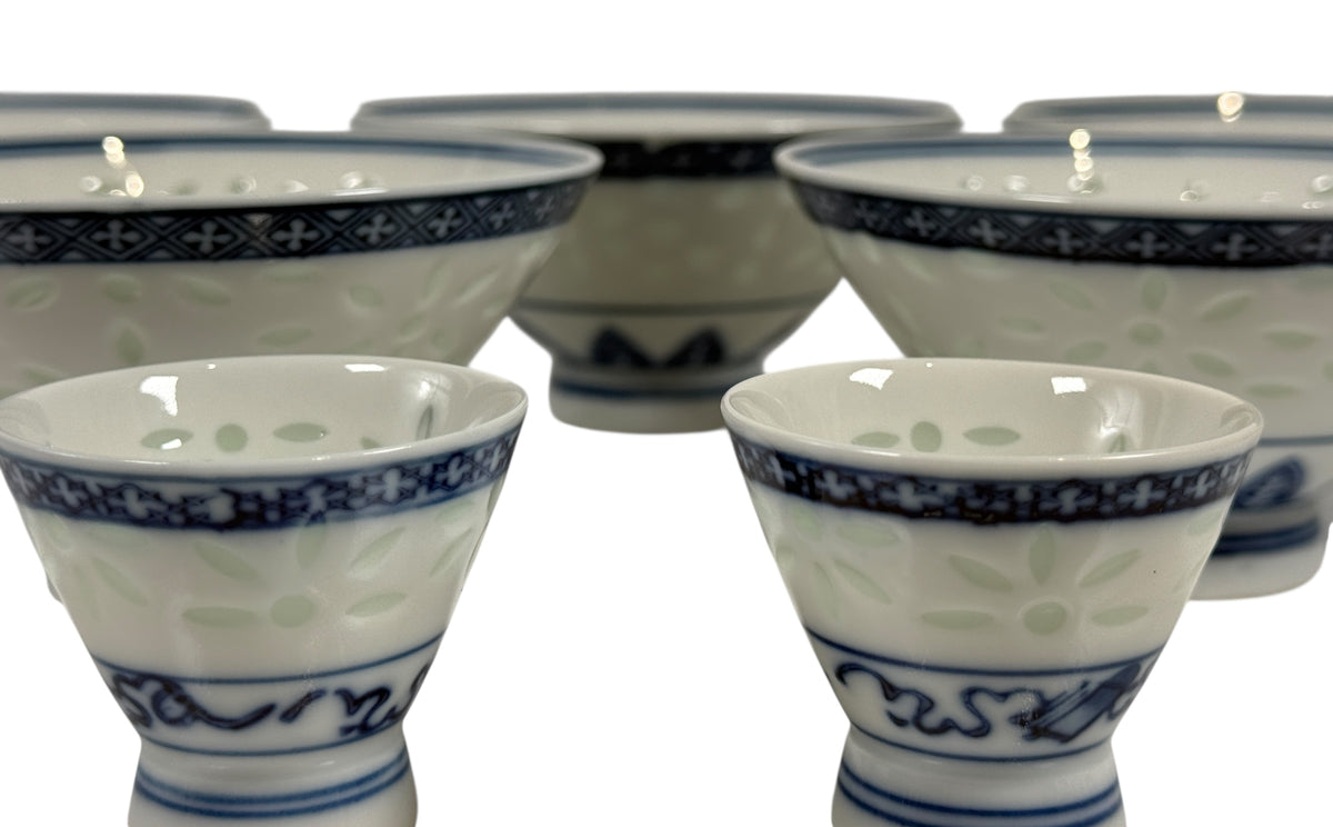 Ensemble de tasses à riz et à saké en porcelaine japonaise – Motif pétales bleus réticulés (7 pièces)