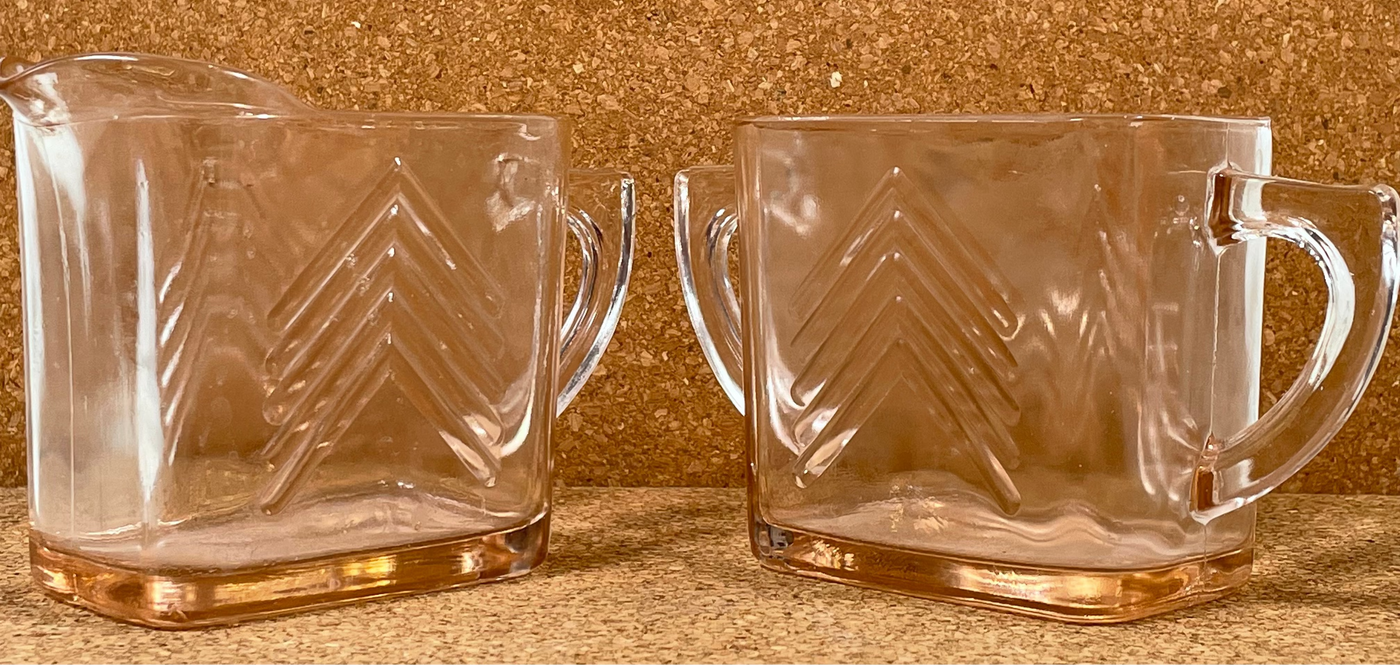 Ensemble de crème et de sucre vintage HAZEL ATLAS PINK Chevron, verre dépression.