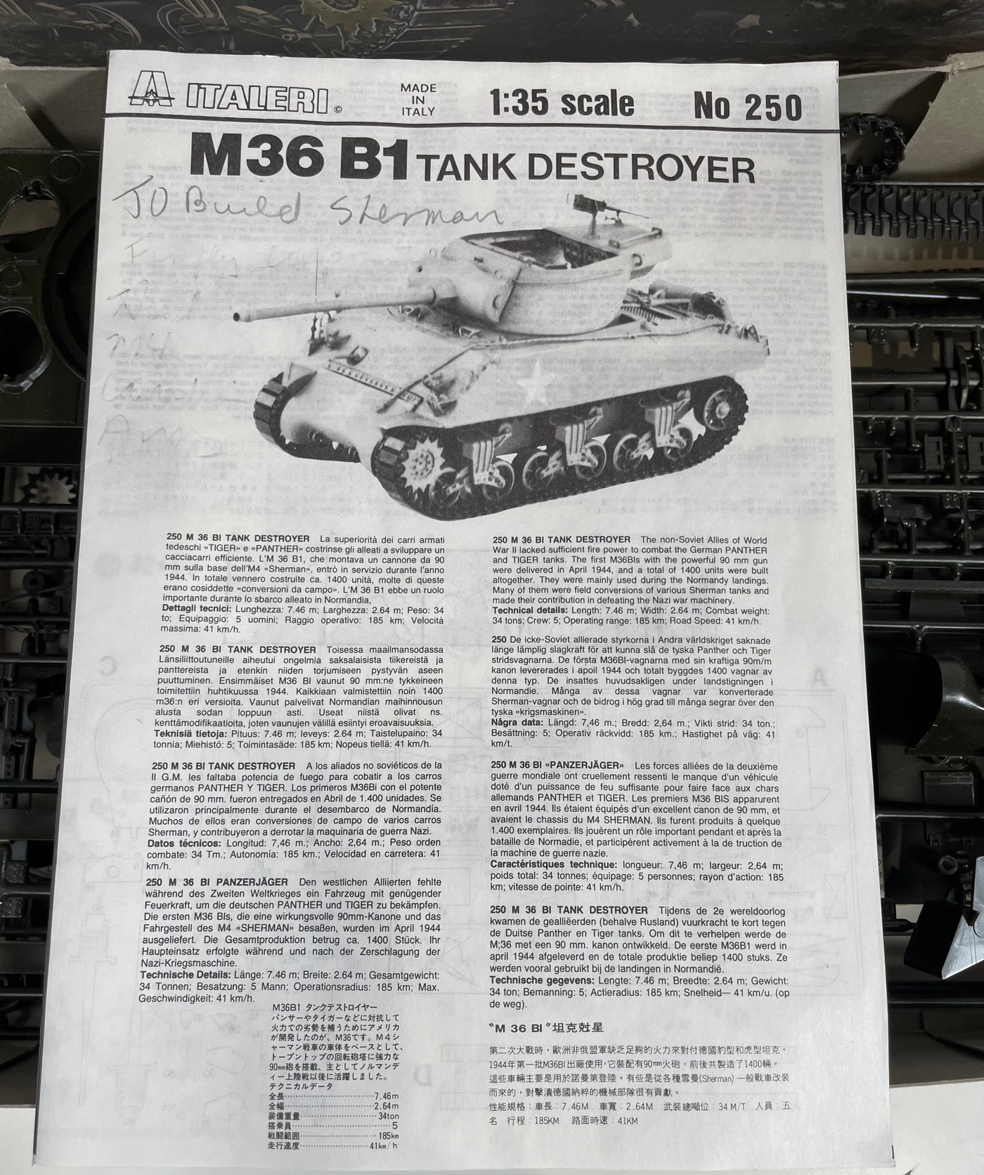 ITALERI 1:35 M36B1 90mm Tank Destroyer Model Kit #250 GMC *COMPLETE UNSTARTED*