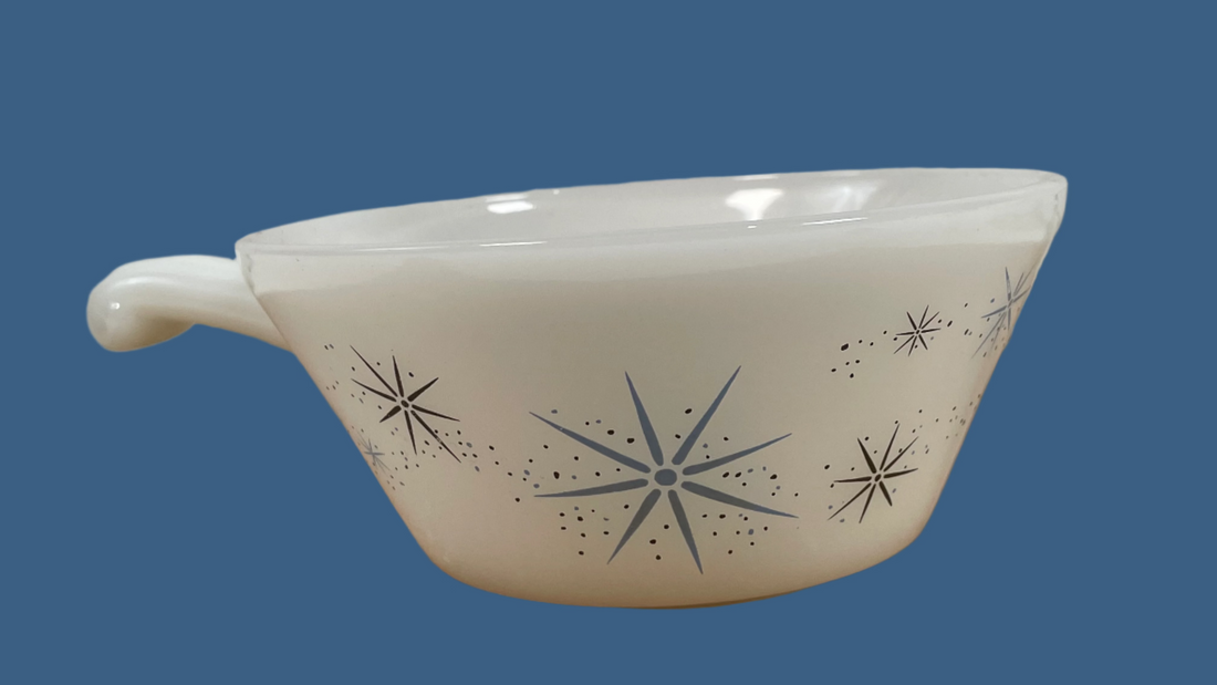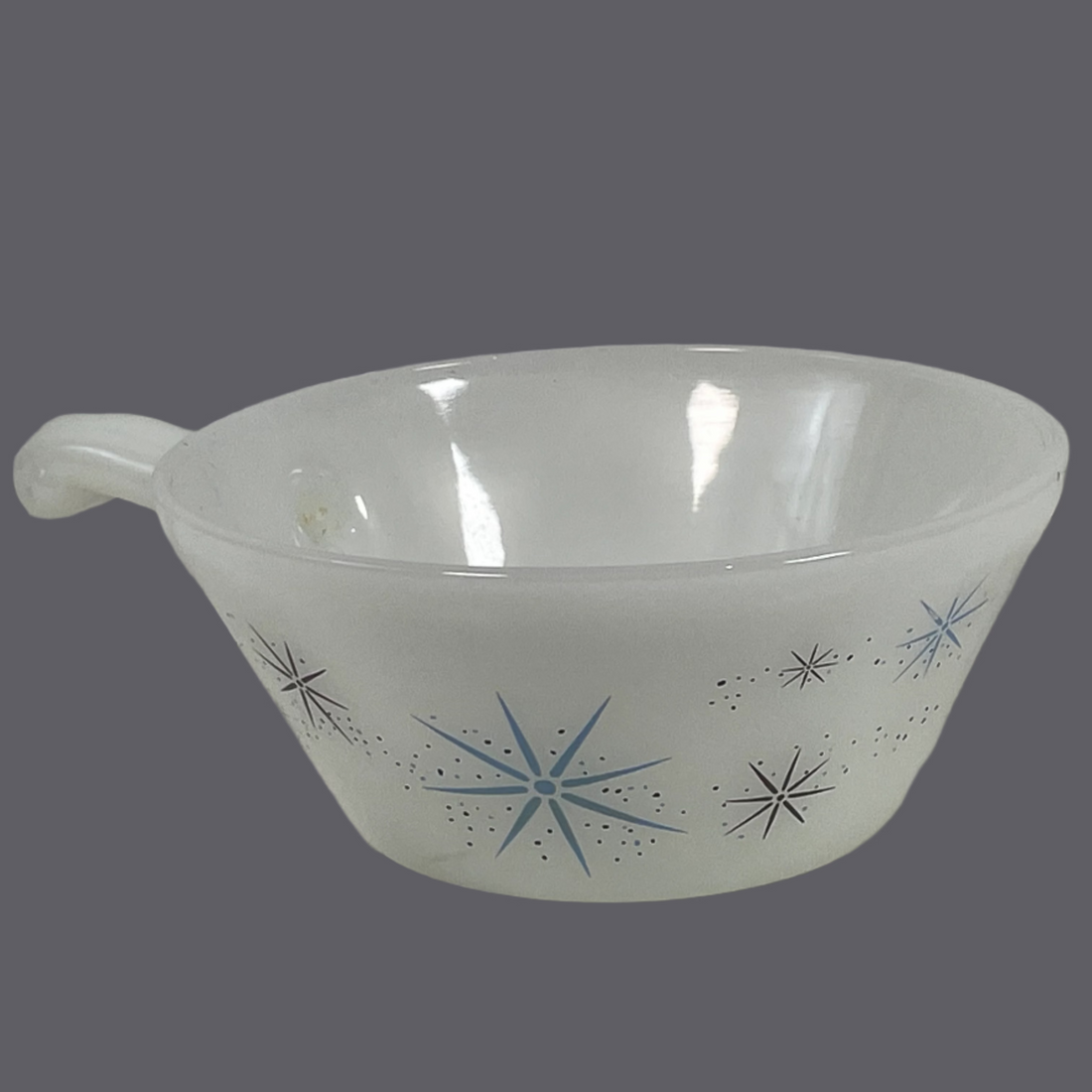 Vintage Fire-King Milk Glass Soup Bowls – Atomic Starburst Blue Heaven – Set of 4